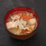 ・夕食 もずく酢、イヌリンヨーグルト、枝豆、キャベツ千切り、牛バラ肉と舞茸の炒め物、餃子巾着、キャベツ・玉ねぎ・鶏団子のスープ